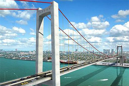 Maputo Bridge in Mozambique is earth anchored suspension bridge with a main span of 680m and gantry …