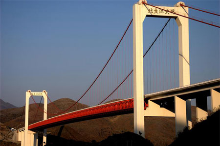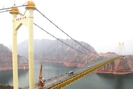 劉家峽大橋主跨536米,橋面寬度15米,橋塔采用鋼管混凝土門式框架結構,為...