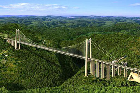 貴州壩陵河大橋主橋為1088米鋼桁架懸索橋,橋梁全長2237米,東岸引橋長940...